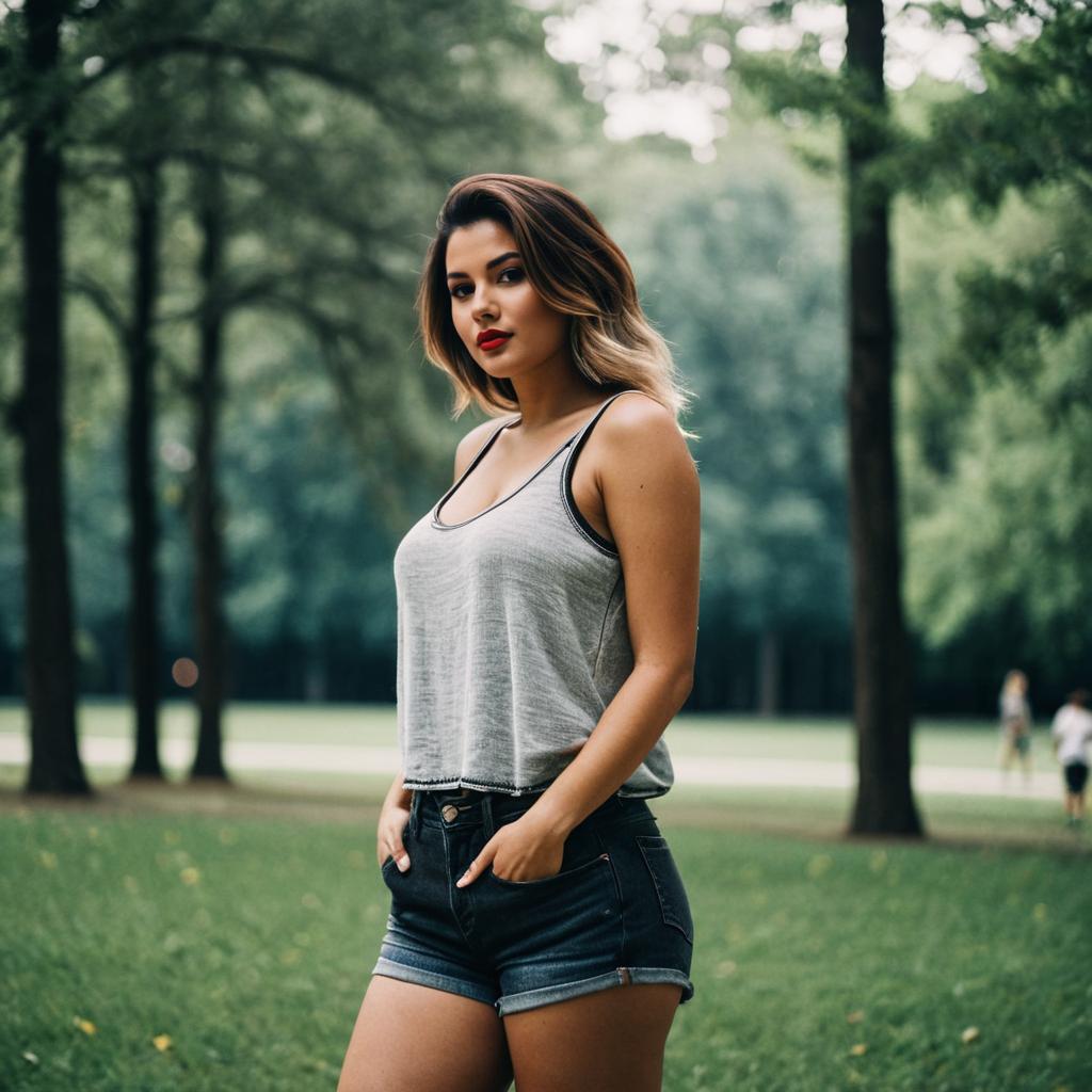 Outdoor fashion shot of tan-skinned woman with ombré hair and subtle red lipstick, massive tits, wearing a loose semi-sheer tank top and tiny denim shorts, standing in a park, torso slightly twisted and leaning back, both hands gently pulling the hem of the top, dreamy bokeh background of trees, soft natural daylight, outfit in light gray tank top with faded black denim shorts, high-end lifestyle photography
