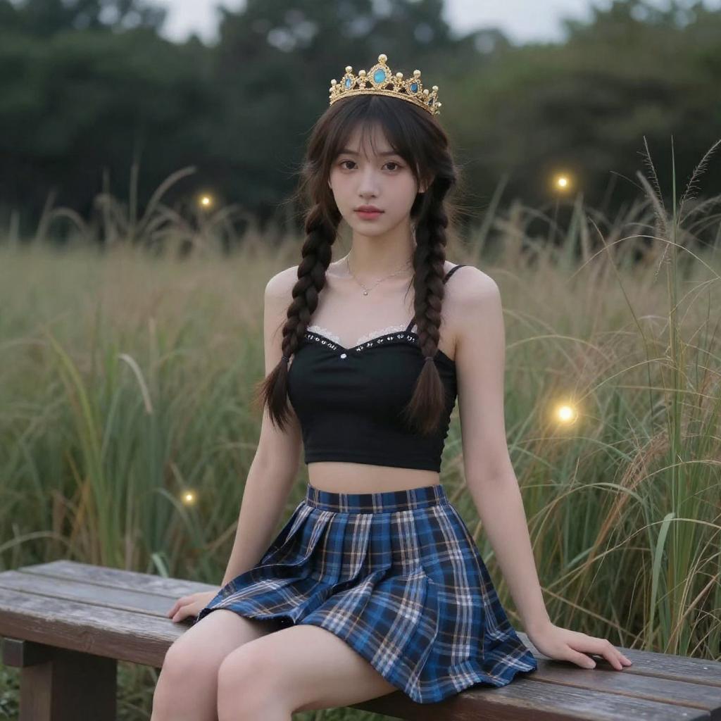 Portrait of a young woman with long braided hair wearing a golden crown, a black crop top with white detailing, and a blue plaid skirt. She is seated outdoors on a wooden bench surrounded by tall grass and blurred forest trees in the background during dusk. Small glowing lights float around her, creating a magical atmosphere.