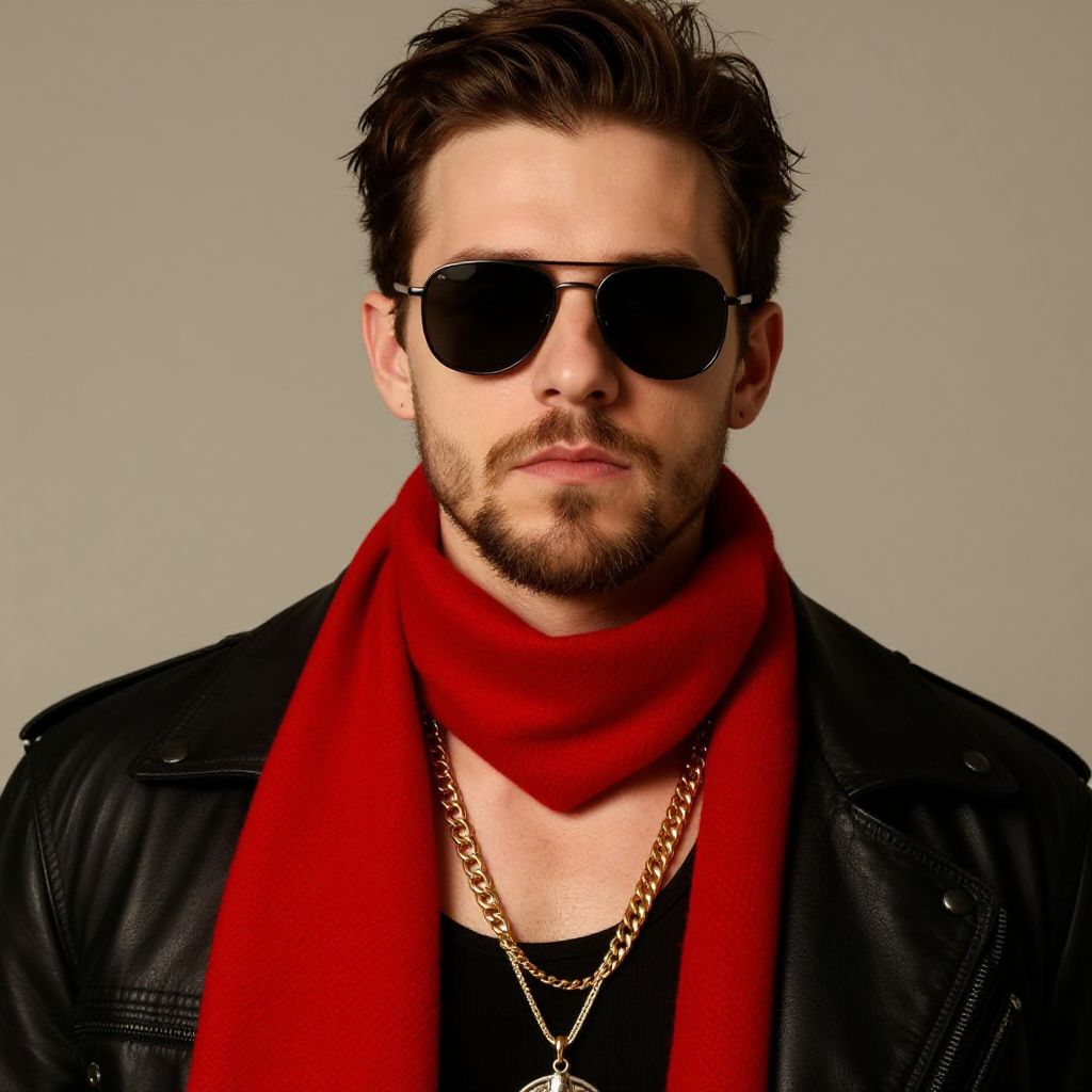 Photograph of a white man with light skin, short brown hair, and a trimmed beard, wearing black aviator sunglasses, a black leather jacket, a red scarf, and a gold chain necklace over a black shirt. The background is a plain, light gray. His expression is neutral, and the lighting is even, highlighting the textures of his scarf, jacket, and beard. The style is modern and slightly edgy, with a focus on fashion and accessories.