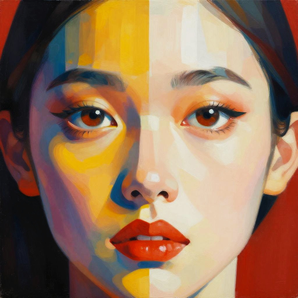 What is wide interocular distance, abstract artistic interpretation of faces with wide space between eyes, surreal colors, geometric shapes, modern art style, vivid contrasts