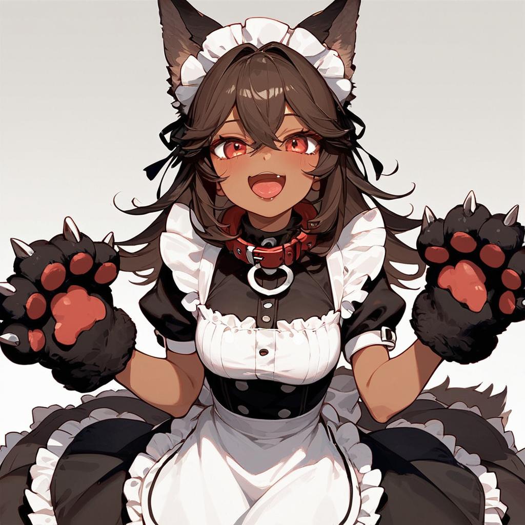 Score_9, source_anime, 1girl, solo, dark-skinned female, dark skin, animal ears, red eyes, animal hands, maid, white thighhighs, thighhighs, maid headdress, long hair, apron, paw gloves, brown hair, open mouth, looking at viewer, fang, smile, gloves, :d, dress, skin fang, black dress, short sleeves, hair between eyes, spikes, collar, simple background, frills, bangs, wolf ears, white apron, dog ears, grey background