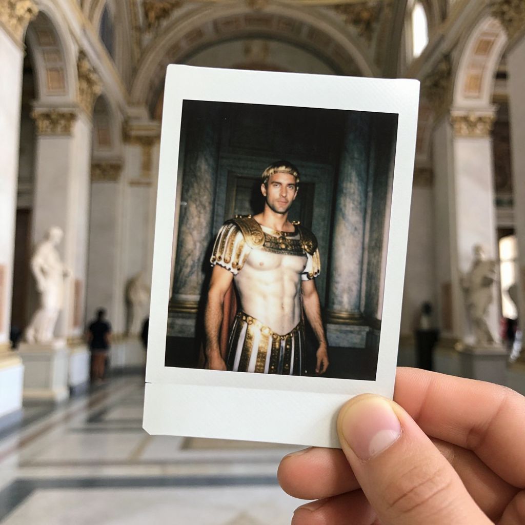 A photograph of a hand holding a polaroid picture of a muscular, young man with short dark hair, wearing a gold and black ancient Greek-style armor with a chest plate and shoulder armor. The background of the polaroid is a dark, stone-walled room. The polaroid is held in front of a grand, ornate, marble hallway with tall arches and white statues in the distance. The hand holding the polaroid is light-skinned with short nails. The image has a slightly surreal, digitally enhanced look with vivid colors and sharp contrasts.
