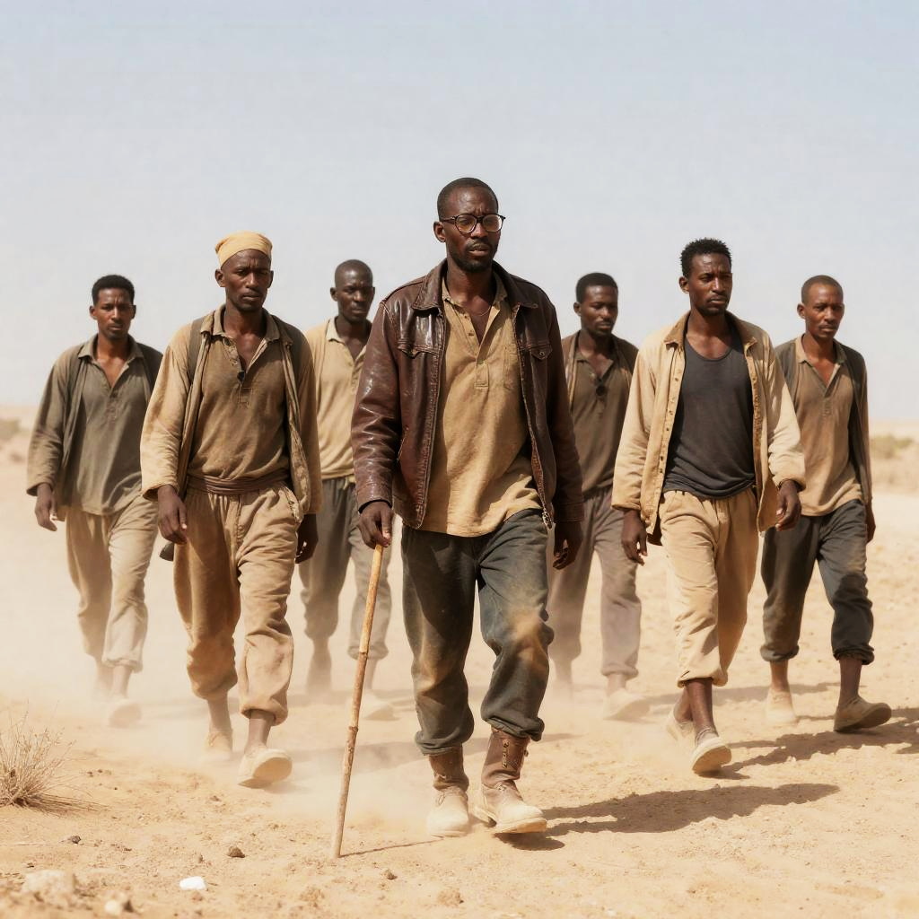 Men Carrying Box in Desert Landscape