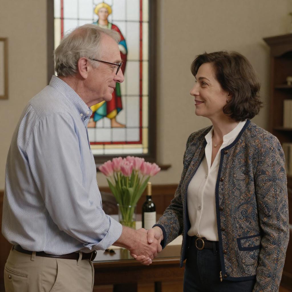 Photograph of an older man with gray hair and glasses, wearing a striped shirt, shaking hands with a woman with short brown hair, wearing a white blouse and patterned jacket. They stand in a warmly lit room with a stained glass window, a bottle on a table, and pink tulips. The woman smiles, and the man looks at her intently.