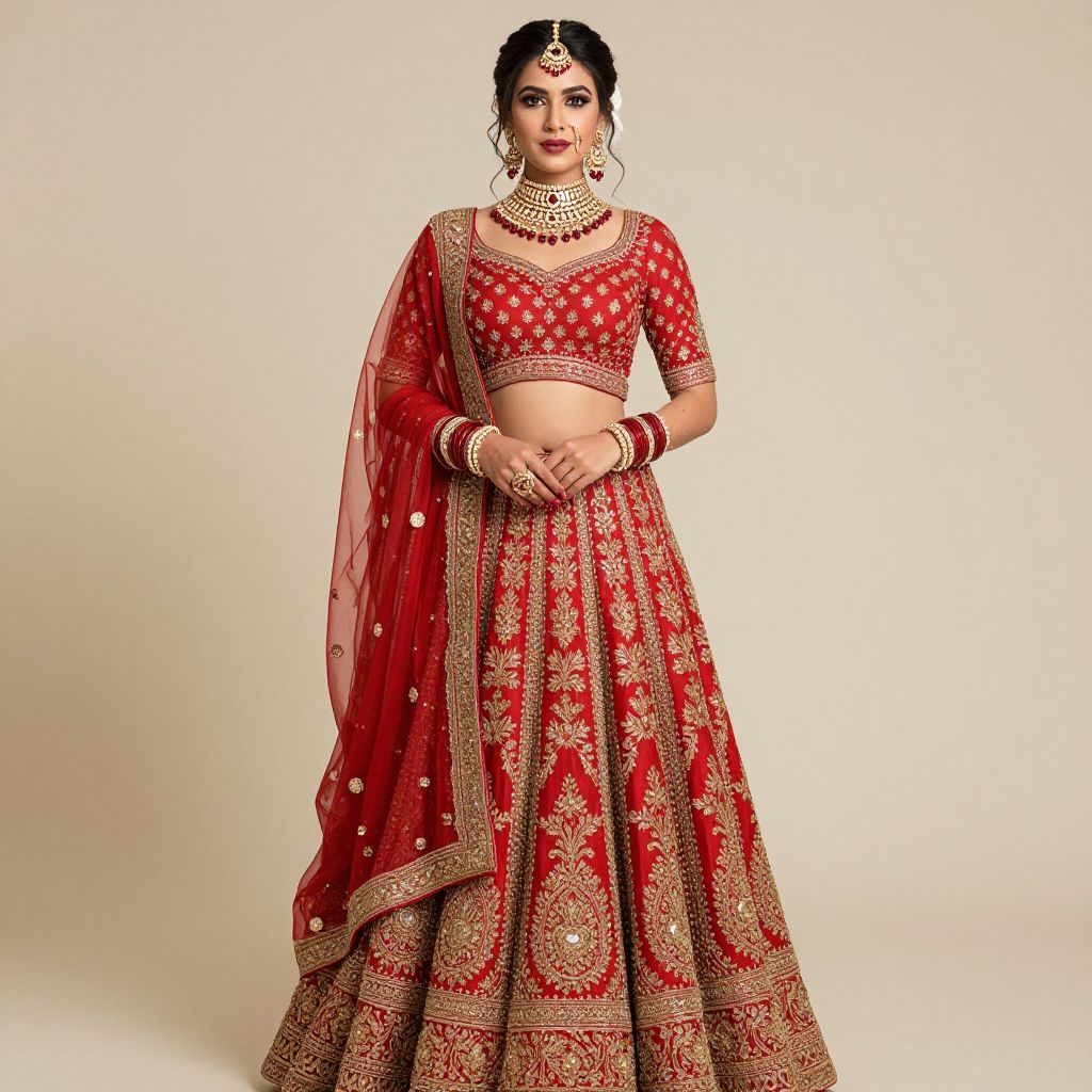 Woman wearing a vibrant red traditional Indian wedding lehenga with intricate gold embroidery, complemented by a sheer dupatta, ornate jewelry, and bold makeup, exuding elegance against a plain background.