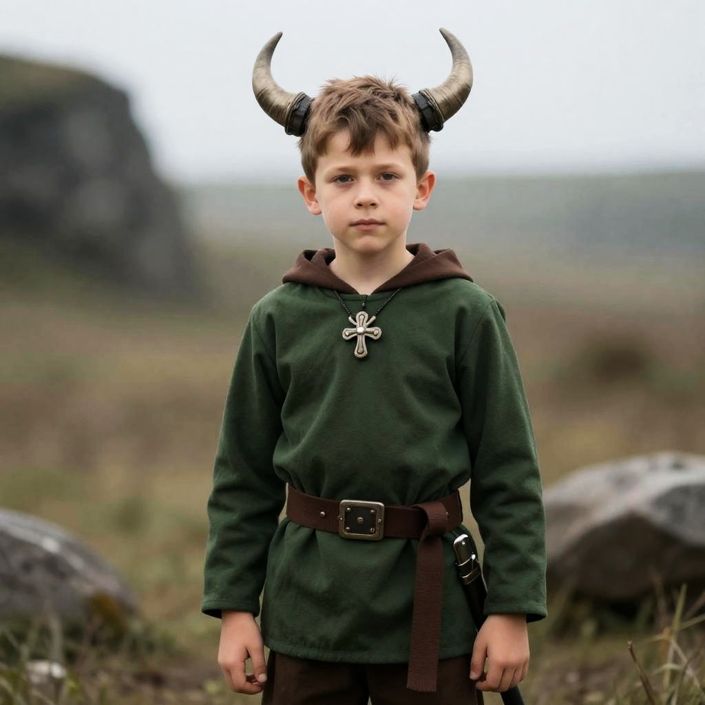 Victorious Viking Boy Costume, boy with horns and a green shirt with a brown hood