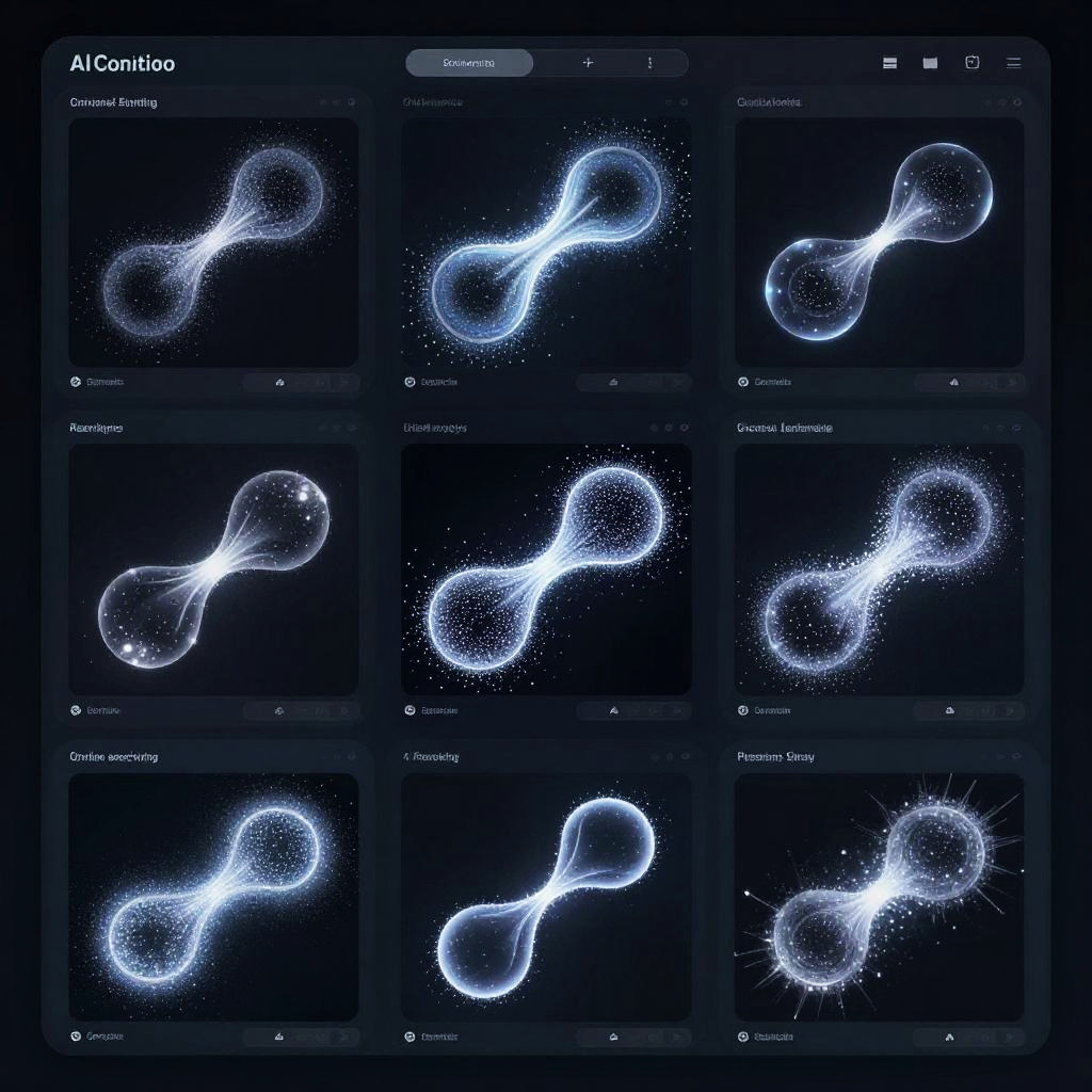 Online image AI generator dashboard, multiple images forming from data streams, fluid shapes made of light particles, futuristic UI elements glowing softly, dark mode aesthetics, ultra detailed
