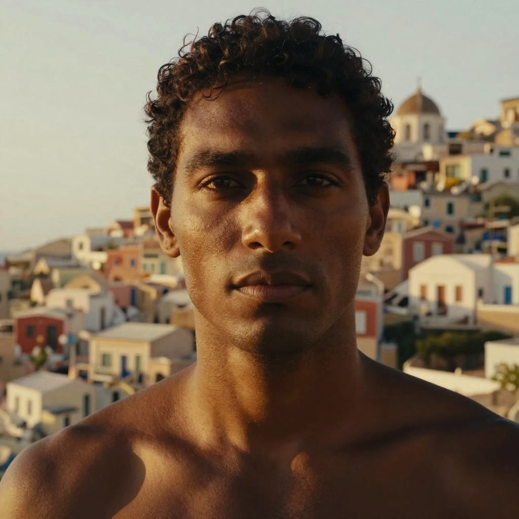 Swarthy skin glowing under the warm golden sunlight, detailed portrait of a person with deep olive tones, textured natural complexion, soft shadows accentuating facial features, vibrant background of a Mediterranean village, cinematic lighting.