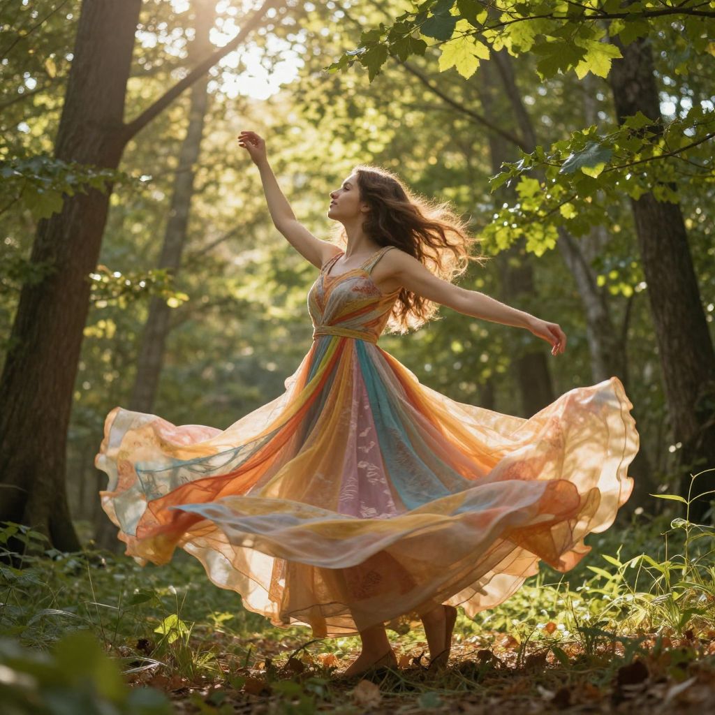 Photograph of a woman with long brown hair, wearing a flowing, rainbow-colored sundress, dancing in a sunlit forest, sunlight filtering through leaves