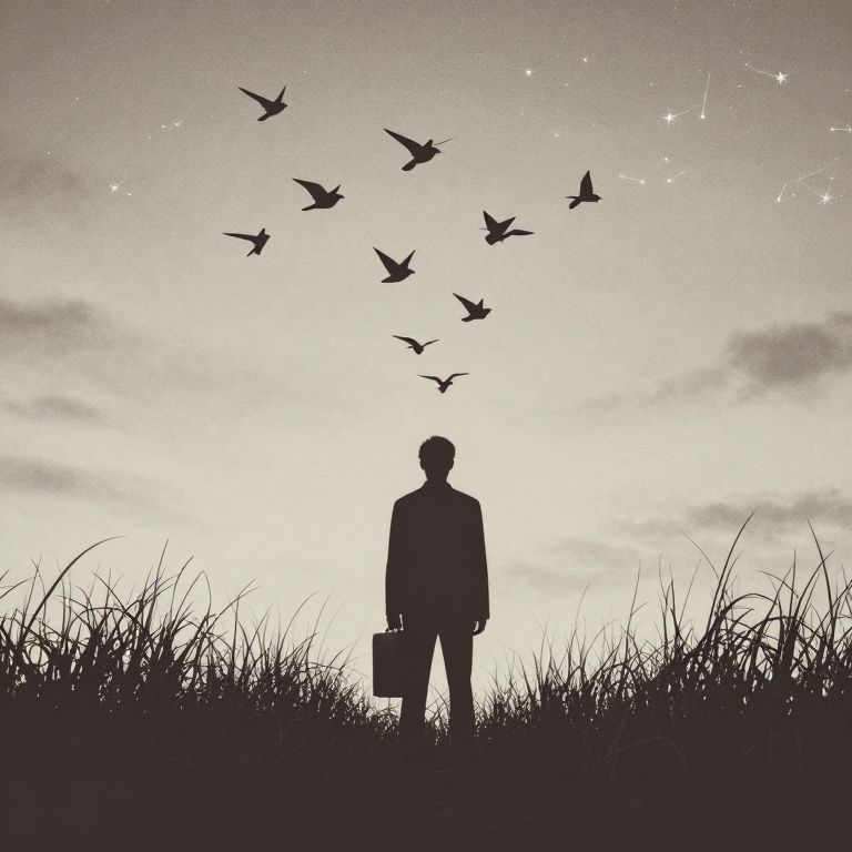 A black-and-white silhouette photograph depicts a standing man with a briefcase, centered in the foreground, gazing at a flock of birds in mid-flight against a cloudy sky. The man's silhouette is completely black, contrasting sharply with the lighter background. He stands on tall grass that extends across the bottom of the image. The birds are scattered above him, creating a dynamic, upward movement. The sky is mostly gray with subtle cloud patterns, adding texture. Small, sparkling stars are scattered in the upper right corner, adding a touch of whimsy. The overall mood is contemplative and serene.