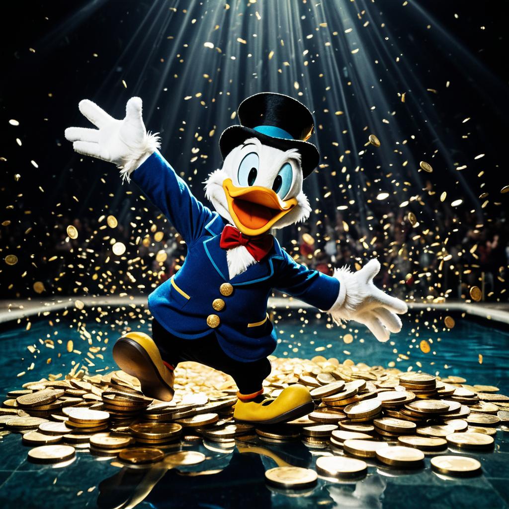 Cool Moonlight Scrooge McDuck dove into his pool of gold coins with a gleeful cannonball, feeling the weight of his success lifting off his shoulders. As he swam through the sea of shimmering metal, he knew that every coin represented a victory earned through hard work and dedication. For a moment, he allowed himself to bask in the elation from prosperity, before emerging from the pool, coins cascading off his feathers.