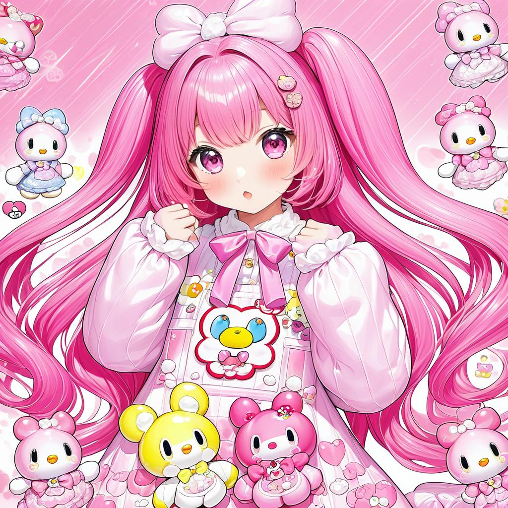 Digital anime-style illustration of a young girl with long, vibrant pink hair in twin tails, adorned with white bows. She has large, expressive pink eyes and a slightly surprised expression. She wears a white, long-sleeved dress with pink accents and a large bow at the collar, featuring a cute, colorful duck emblem. Surrounding her are numerous small, colorful Hello Kitty-like characters in pastel shades of pink, yellow, and white, all with simple, cute facial expressions. The background is a gradient of pink with sparkles, enhancing the whimsical, cute theme. The overall style is bright, colorful, and highly detailed.