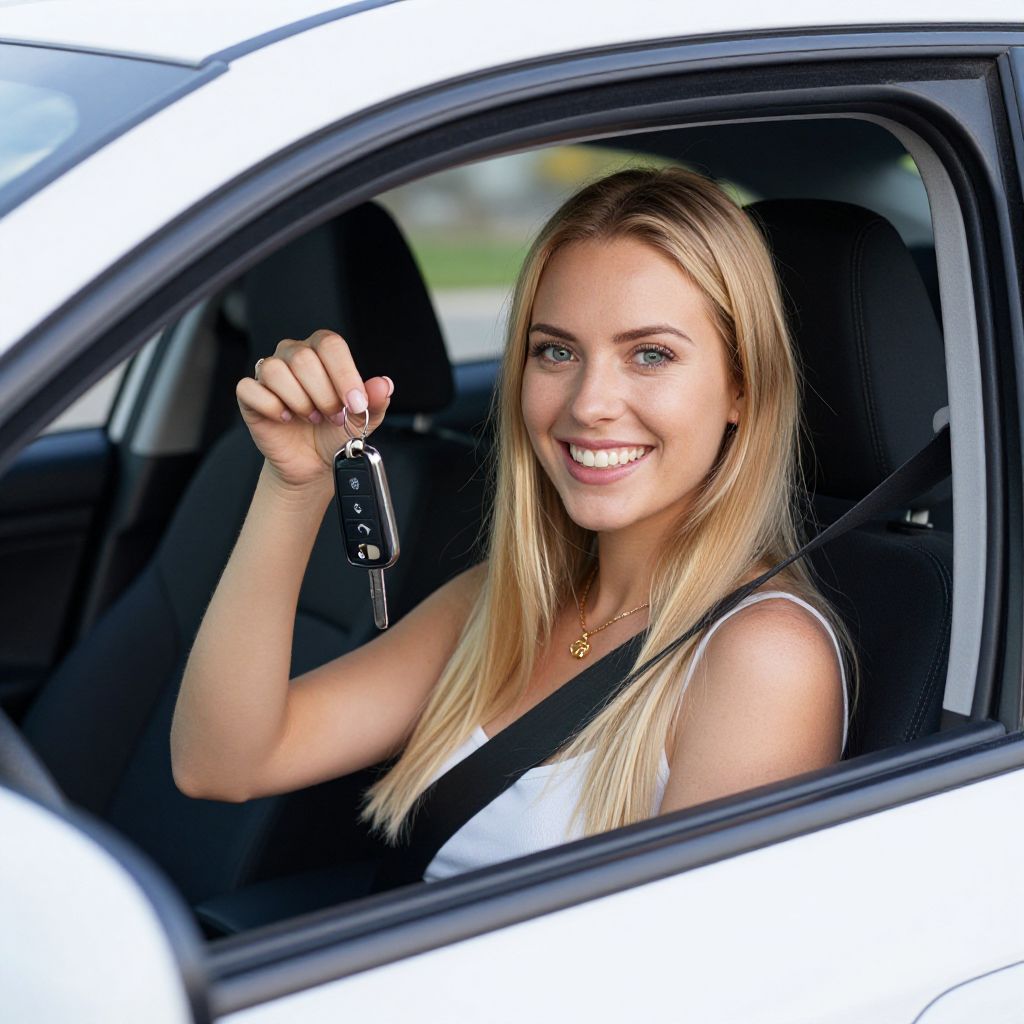Blonde-haired woman seated inside a white car, smiling brightly while holding a black car key fob, showcasing her joy and pride as she sits comfortably in the driver's seat.