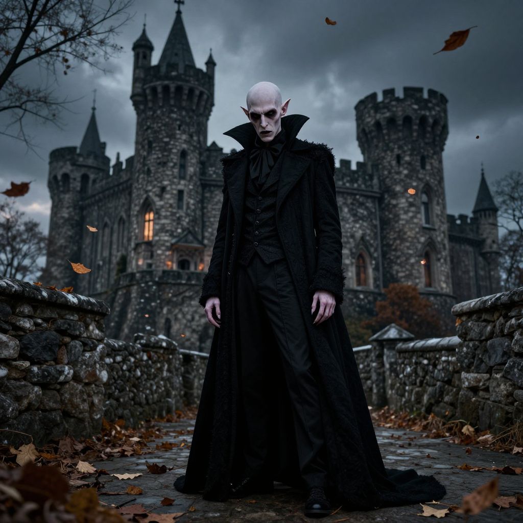 Magical night, Stunning beautiful, extremely detailed photo, super realistic photo, dramatic photo, spiritual, magical mysterious atmosphere, Halloween, vampire Nosferatu, creepy man with bald head and pointy ears, pale skin, creepy face, vampire, tall, thin, stooped, long nails, black long coat, clothes like Nosferatu, bruises under eyes, sickly emaciated face, halloween, standing in front of medieval castle, haunted castle, a guy is standing on the territory of a large castle, a guy is standing in front of a castle, a guy is standing close to a castle, large stone walls, a luxurious suit made of expensive fabrics, thick fabrics in clothes, autumn leaves are flying in the wind, twilight, pale skin, night, autumn, autumn leaves, wind, cold, creepy atmosphere, photo for fashion magazine, photo in vanity fair style, highly detailed portrait, 34K uhd