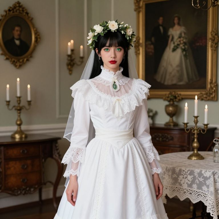 A young bride with bright green eyes, full red lips, and a straight black hairstyle, wearing a traditional European marriage dress with lace trim, a high collar, and a wide sash, standing in a candle-lit Victorian-era hall with antique furniture and a large wedding portrait on the wall, complete with floral crowns and vintage lace table linens.