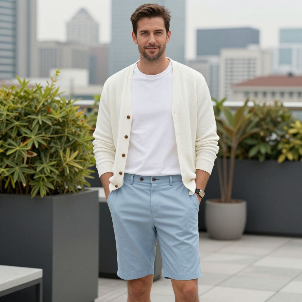 A man, white crew neck t-shirt, light blue tailored shorts, grey slip-on canvas shoes, soft cotton cardigan, rooftop oasis, city skyline backdrop, cameraphone style, relaxed smile, casual vibe.Man has masculine face and piercing eyes