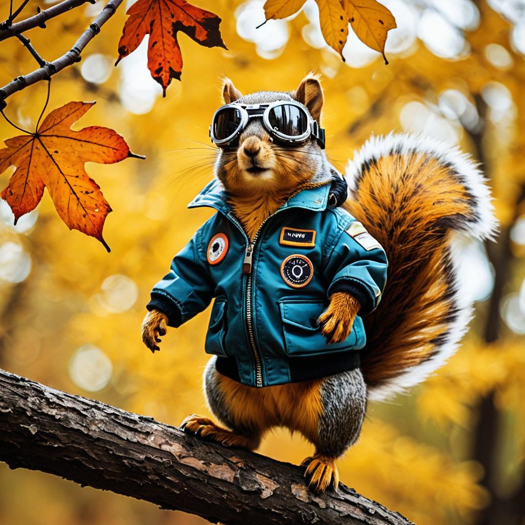 The squirrel is standing upright wearing a tiny pilot jacket and goggles, perched on an autumn tree branch with falling leaves, realistic photography with vibrant colors, sharp details, and natural lighting.
