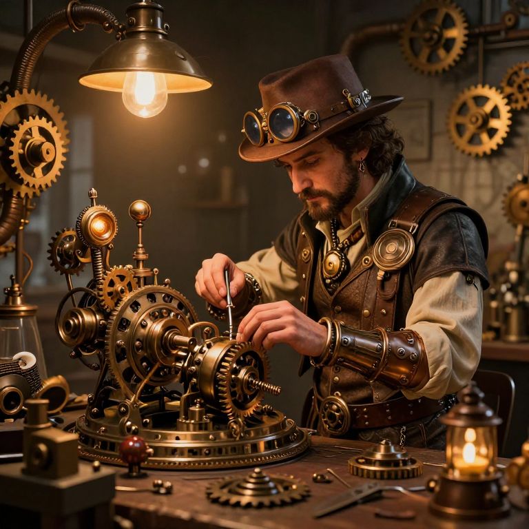 Steampunk inventor with brown hat and goggles, tinkering with intricate clockwork machinery under warm, glowing lamp in dimly lit workshop.