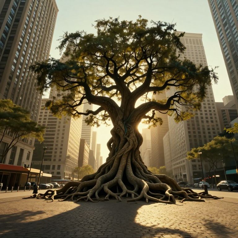 In a surreal landscape reminiscent of Dalí's dreamscapes, depict an enigmatic urban setting where a colossal ancient tree emerges from the heart of a bustling city square. The tree's twisted roots intertwine with and penetrate the cobblestones beneath, while its towering branches pierce the surrounding skyscrapers, creating a harmonious yet unsettling blend of nature and civilization. Golden hour light bathes the scene, casting long shadows across the square and enveloping the image in an ethereal atmosphere that evokes both awe and unease.