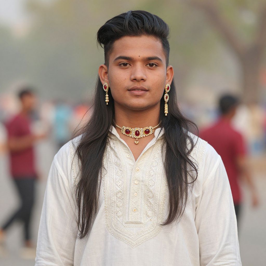 "velu nachiyar costume, 1boy, male focus, solo, jewelry, necklace, blurry background, looking at viewer, blurry, long sleeves, hat, earrings, red sash, layered sleeves, sash, closed mouth Realistic photo of casual sexy person with pretty face"