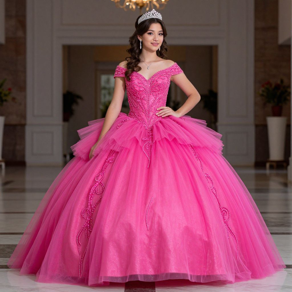 Photograph of a woman in a vibrant pink, off-shoulder, ball gown with a voluminous tulle skirt, wearing a silver tiara