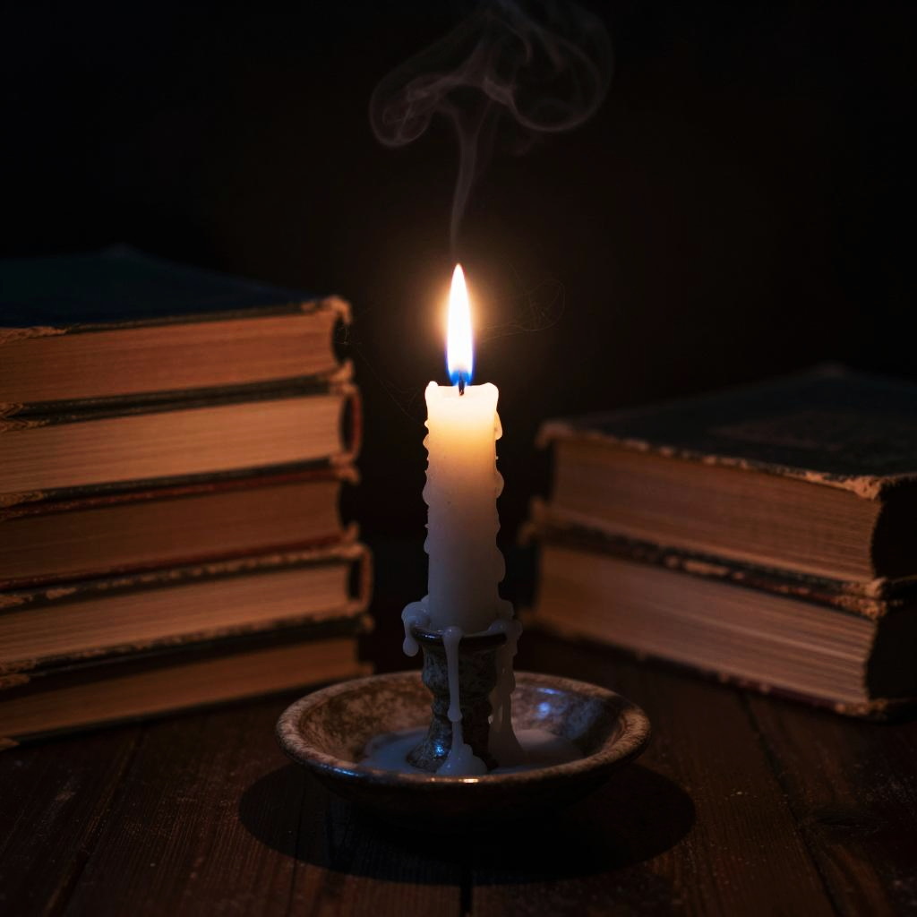 Candle in dark room with dripping wax on rustic holder, dim light revealing old books and cobwebs, faint smoky haze, quiet, eerie and intimate ambiance