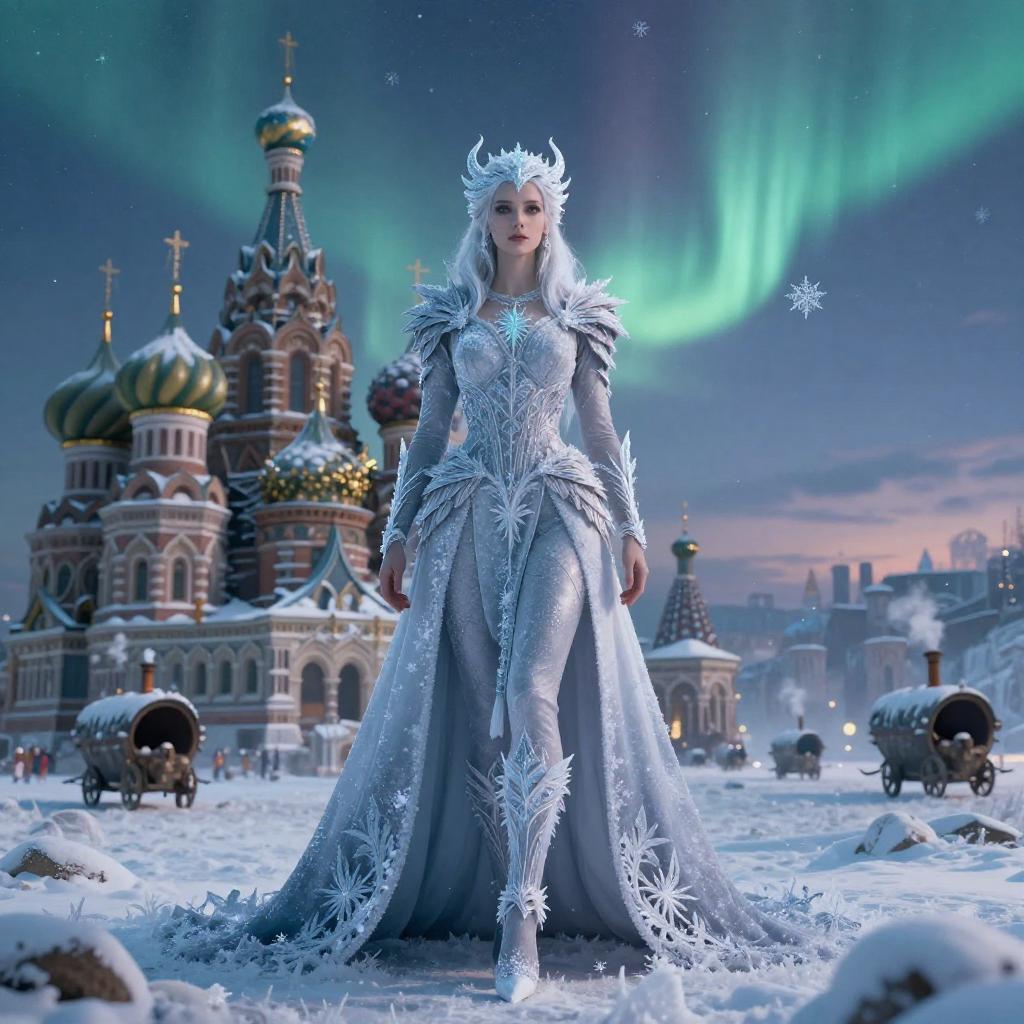 Modelshoot style, (extremely detailed CG unity 8k wallpaper), full body shot of frostbound huntress queen, frozen steppe with an onion-domed ruined city skyline at blue hour, swirling crystalline snowflakes, aurora-tinged sky reflecting on gilded domes, distant caravan silhouettes and smoking chimneys, professional majestic oil painting by Sandro Botticelli and Yoshitaka Amano, Studio Ghibli, trending on ArtStation and CGSociety, intricate, high detail, sharp focus, cinematic lighting, photorealistic art by midjourney and Greg Rutkowski