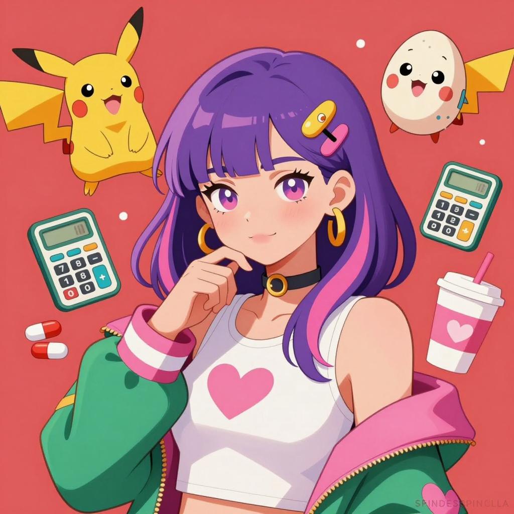 Digital illustration of a young woman with long black hair, sitting in a blue chair, wearing an orange tank top and red-striped shorts, holding a soda can while looking at a laptop. Her laptop screen shows a purple-haired anime character. The desk has books, a bag of chips, a "Pus" can, a headset, and a blue bag on the floor. A window with blinds is on the right. Various anime posters and a red helmet are on the wall. Wood floor and desk.