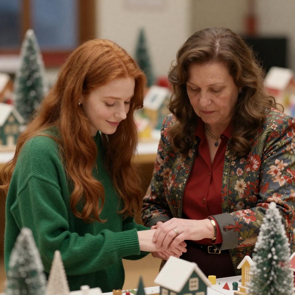 Photograph of a Christmas scene. Three people: blonde woman in black coat, red-haired woman in beige coat, and boy in brown suit with red cap. Blonde woman behind glass counter with train sets, red-haired woman beside her, boy in foreground. Christmas tree with lights on right. Snow-covered mini houses and trees in foreground. Intense expressions not visible.