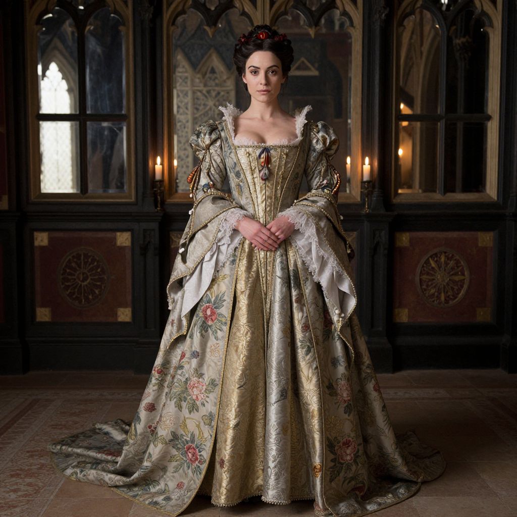 Photo of a woman in a meticulously crafted Anne Boleyn costume, standing dramatically in front of a mirrored Tudor wall, wearing a layered gown with floral patterns and a flowing train, her face is serene yet regal with deep brown eyes and fine, straight eyebrows, the setting is dimly lit with soft candlelight reflecting off the mirrors, emphasizing the elegance and historical detail of the outfit.. The woman has big tits and cute face
