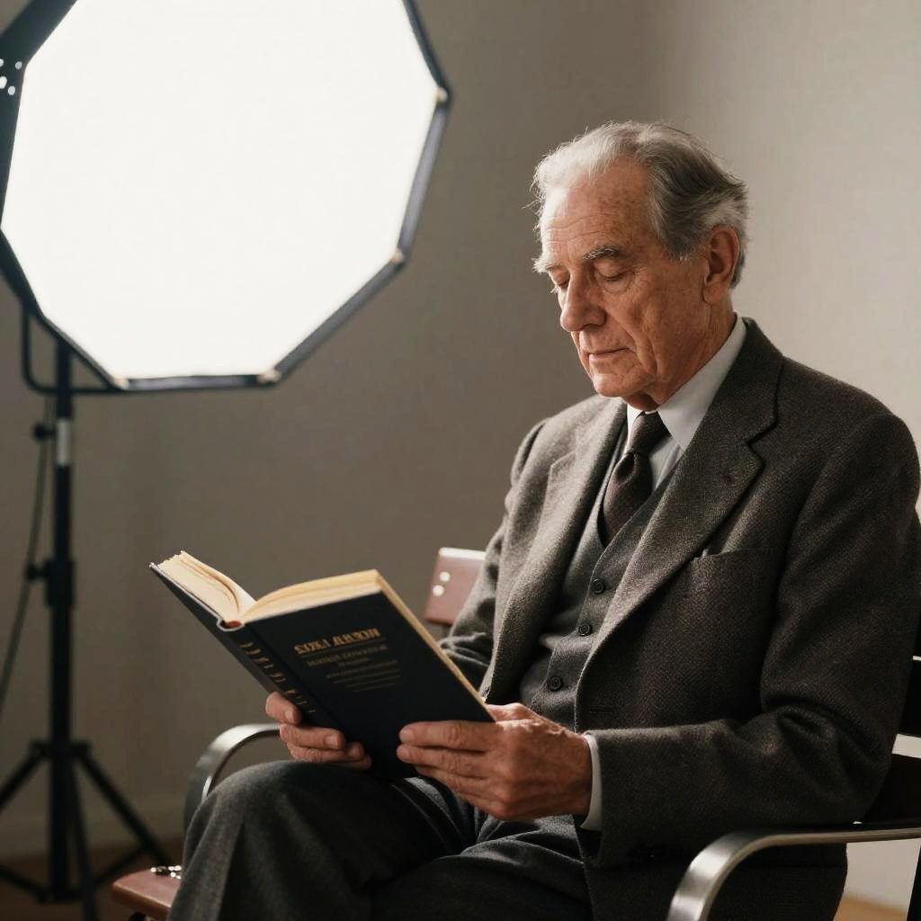 Photograph of an elderly man with gray hair, wearing a brown suit and tie, reading "Le Figaro" newspaper at a café. Background shows
