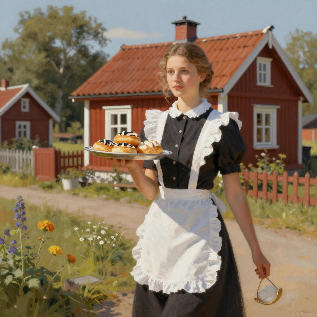 Swedish maid carrying a tray with traditional Swedish pastries, standing in front of a charming countryside cottage, vibrant natural colors, impressionistic digital art style