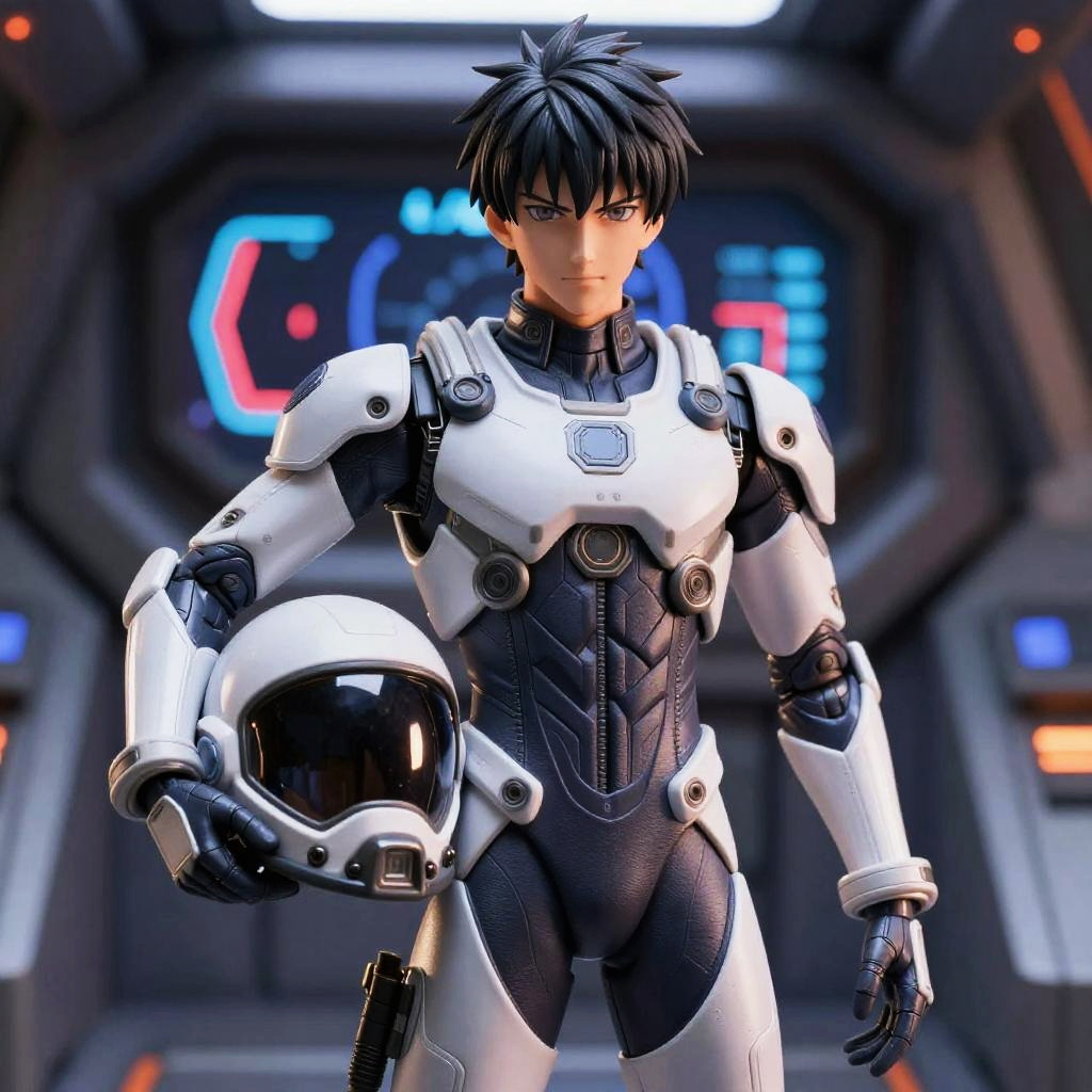 Male anime figure dressed in sleek sci-fi pilot suit, helmet under one arm, futuristic cockpit as background with neon dashboard lights, intense determined gaze, short spiked hair, highly detailed gear, cinematic lighting emphasizing heroic stance.