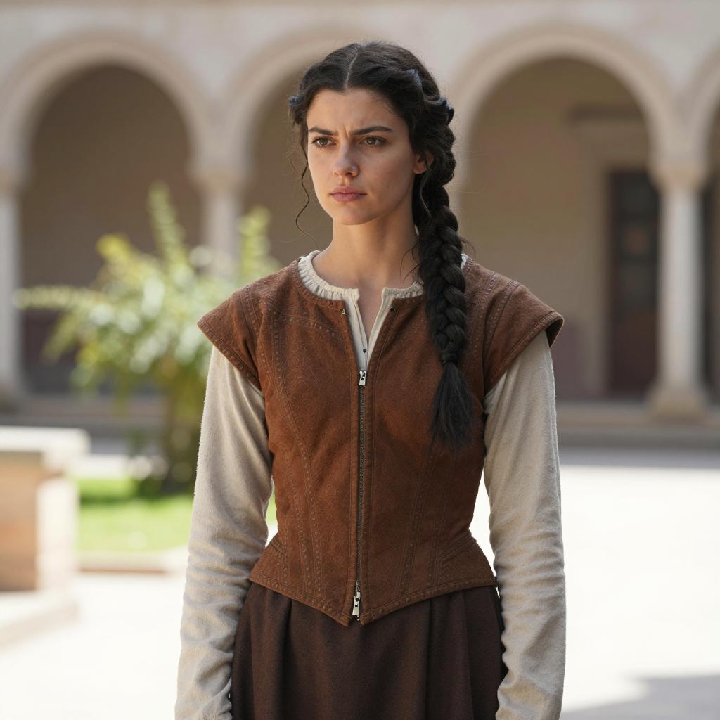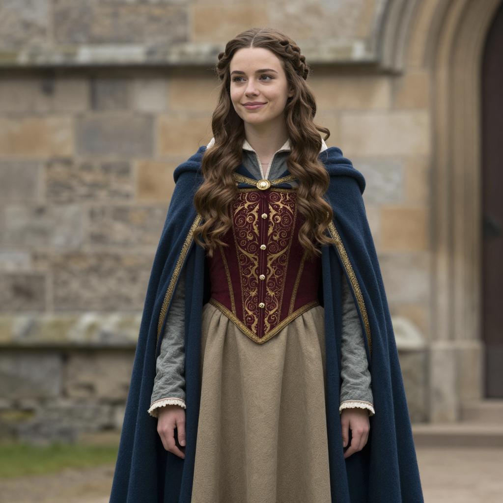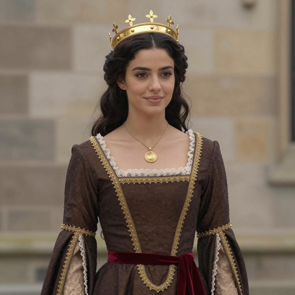 Portrait of a young woman dressed as a medieval queen wearing a golden crown and a dark brown lace-trimmed dress with gold accents. She has long black hair and a red velvet waistband, complemented by a gold necklace with a pendant. The image is captured in natural daylight against a stone wall background, highlighting a regal and historical appearance.