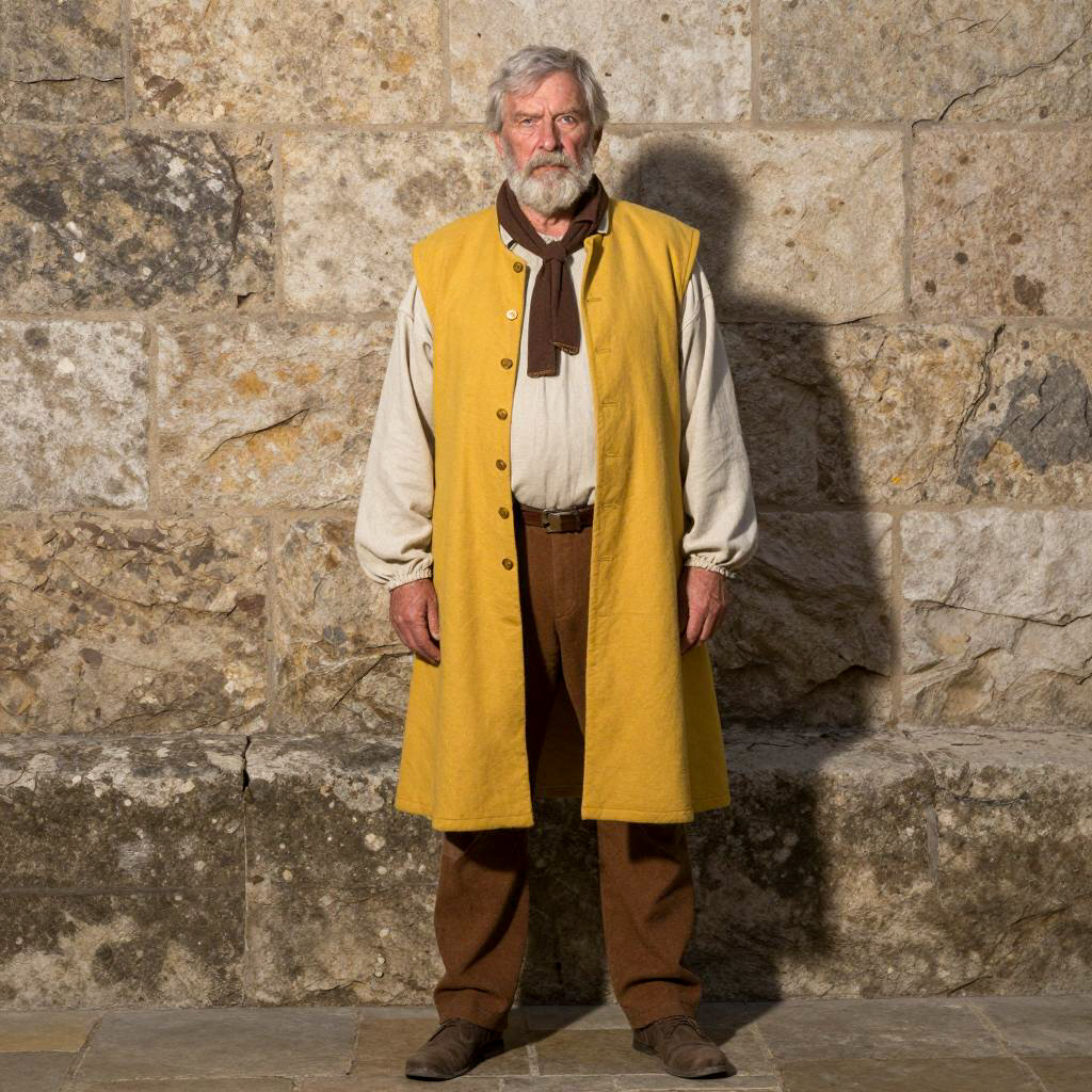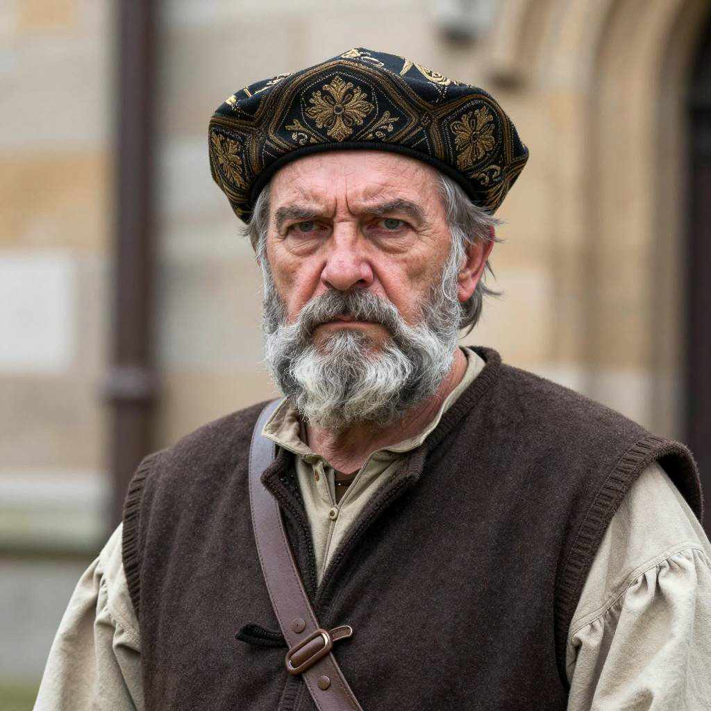Close-up portrait of an elderly man wearing a detailed medieval costume consisting of a beige shirt with puffy sleeves, a dark brown vest, and an ornate patterned hat. The man has gray hair and a full beard, a stern expression, and slightly aged skin. The background shows a blurred stone building, suggesting a historical or theatrical setting with natural soft daylight.
