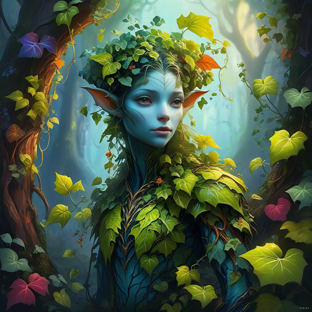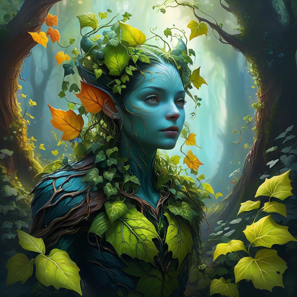 Full body digital art painting of a plant-based creature, magical forest glade, bark skin, tendrils, ivy, vibrant colors, detailed foliage, oil painting, humanoid, fantasy, vibrant colors, plant creature, detailed leaves, glade, pretty face, professional, atmospheric lighting