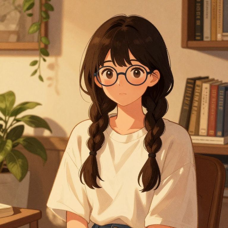 Anime girl generator free design, cozy room interior filled with books and plants, warm lighting, soft textures, cute and shy anime girl with glasses and braided hair, casual modern clothing, detailed background elements, hand-drawn style with rich color depth and subtle shading