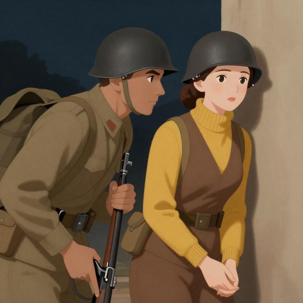 Illustration of two soldiers in World War I uniforms. Male soldier on left, focused expression, leaning forward, holding rifle. Female soldier on right, soft expression, leaning against wall, wearing yellow turtleneck. Both wear gray helmets. Dark blue night sky background. Male soldier's green backpack, female soldier's brown vest. Yellow wall on right.
