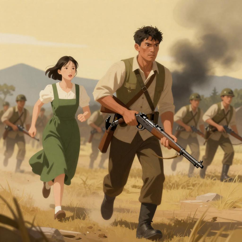 Digital illustration of two World War I soldiers under a dark night sky. The male soldier on the left is wearing a green military uniform and helmet, holding a rifle and leaning forward with a focused expression. The female soldier on the right wears a yellow turtleneck sweater under a brown vest, a helmet, and leans against a yellow wall with a soft, contemplative expression. Both soldiers carry military gear and stand in front of a dark blue sky background.