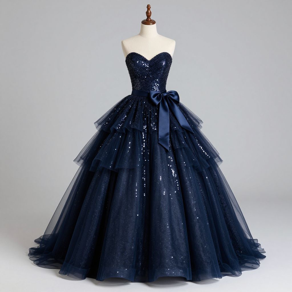 Royal blue off-shoulder prom gown elegantly displayed on a mannequin, featuring intricate beadwork, a sparkling waistband, and flowing chiffon layers, embodying princess-inspired Arabic Dubai style for formal events.