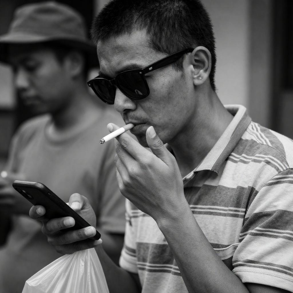 Black-and-white photograph of a man with short dark hair and sunglasses, wearing a striped shirt, smoking a cigarette while holding a phone and a plastic bag in his right hand. Another person with a hat is partially visible in the background. Intense expression on the man's face.