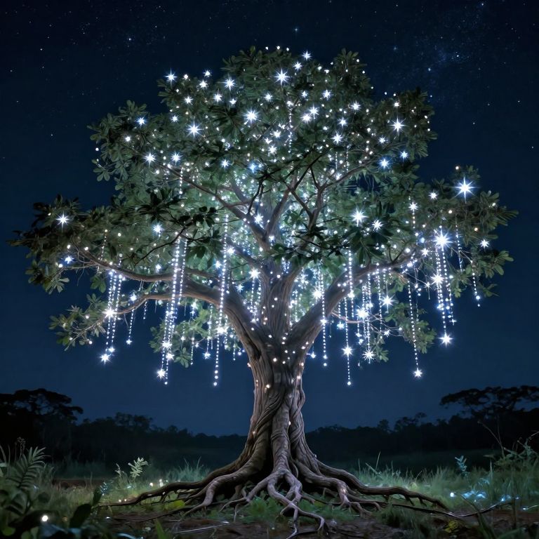 A majestic tree stands rooted in a glowing landscape, its branches adorned with cascading lights that transform into shimmering stars, defying gravity as they float serenely against a starlit night sky.