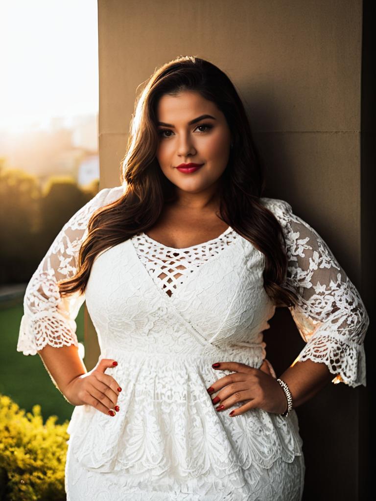 Portrait of a confident plus size woman wearing a white lace dress with 3/4 sleeves and intricate patterns. She has long dark brown hair, red lipstick, and red nail polish, posing with hands on hips against an outdoor wall at sunset.