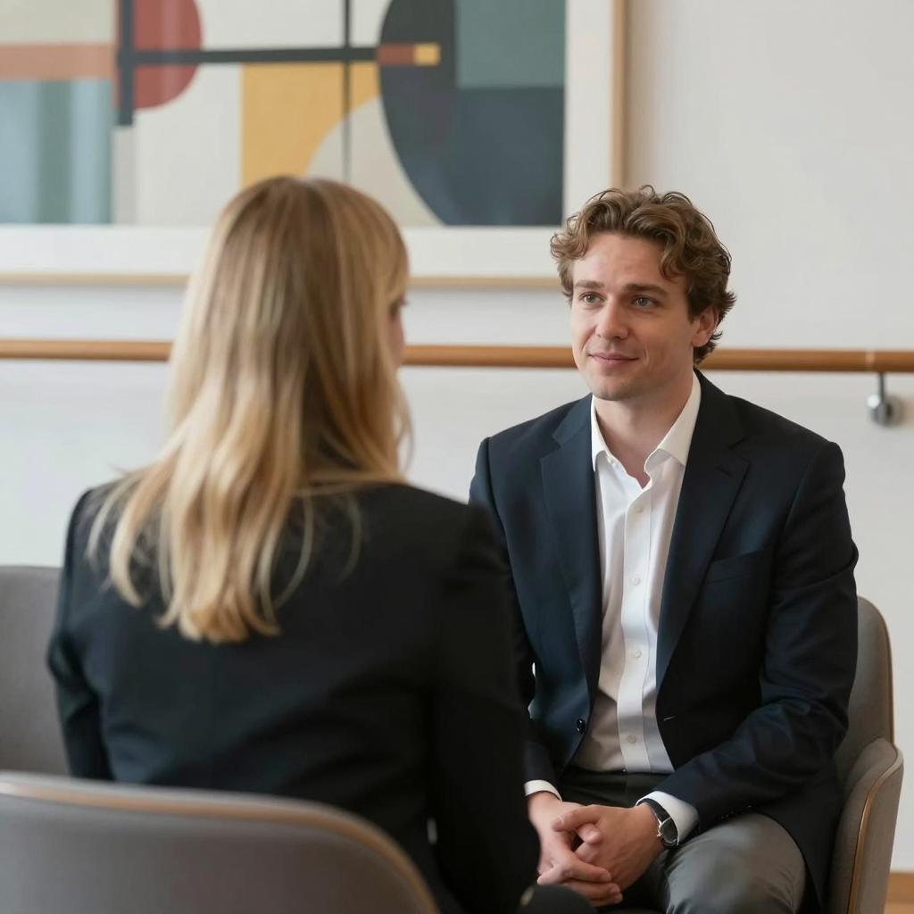 Photograph of an office meeting. Middle-aged man with glasses, striped shirt, tie, and ID badge, sits at desk, hands clasped. Two other men, one with bald head, one with brown hair, in white shirts, face him. Pencils in holder on desk. Framed picture of building in background. Man's expression is neutral, focused.