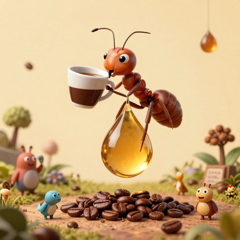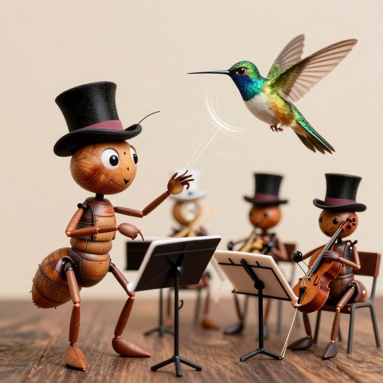 Ant-like musicians dressed in miniature top hats and holding tiny instruments perform a whimsical symphony under the direction of a conductor ant wielding a delicate baton, all set against a vibrant, sunlit backdrop.