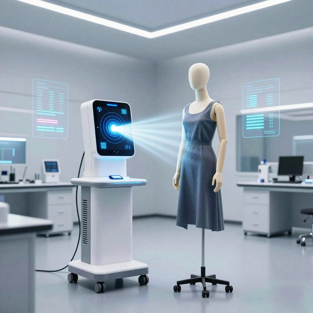 AI clothes remover portrayed as an advanced smart device, emitting light beams to dissolve clothing material on a mannequin, set in a modern minimalist lab environment with floating data streams and transparent screens
