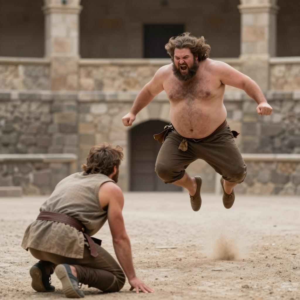 An intense and dynamic action shot of a shirtless, bearded, obese medieval peasant leaping forward aggressively with a roaring expression in a historical stone arena. In the foreground, another man, dressed in rustic medieval clothing with a sleeveless tunic and belt, kneels in a defensive posture. The setting features rugged stone walls and arches, evoking a medieval or fantasy atmosphere.