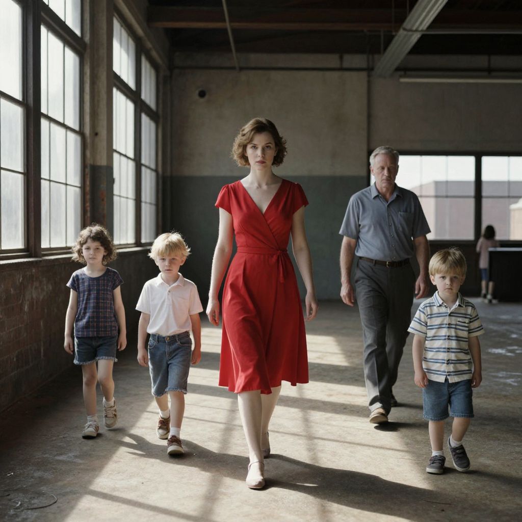 A woman in a red dress walks with her children and husband through a sunlit, industrial space, reminiscent of Edward Hopper's style.
