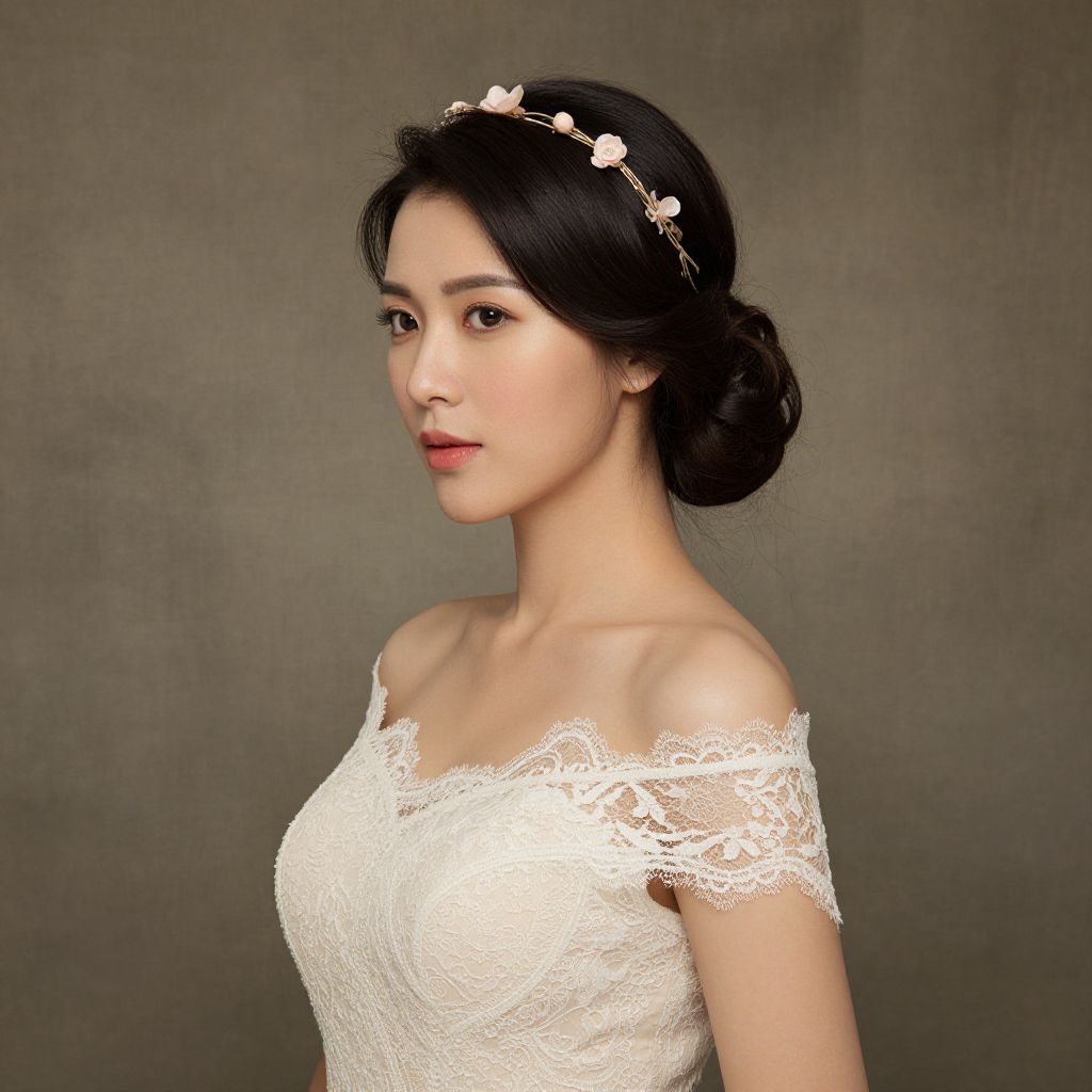 Photograph of an East Asian woman with fair skin and dark hair styled in an elegant updo adorned with a floral headband. She wears an off-the-shoulder, white lace wedding dress that showcases her slender shoulders and collarbone. Her makeup is subtle, with a soft pink lip color. The background is a plain, muted gray, which contrasts with her white dress and draws attention to her. The texture of the lace is delicate and intricate, adding a romantic touch to her appearance. She is positioned slightly to the left, with her gaze directed toward the camera.