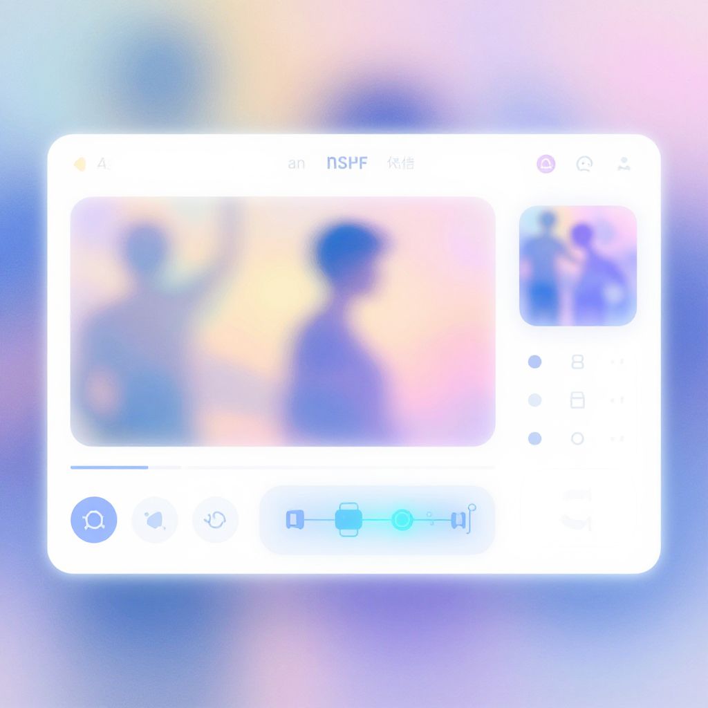 This is a digital image featuring a blurred, pastel-colored background with hues of blue, pink, and yellow. Overlaid on the center is a white rectangular interface with a faint outline of a browser window. Inside the rectangle, there is a "NSFW" label at the top and a small thumbnail in the upper right corner. The bottom of the rectangle displays minimalistic icons including a circular logo and a series of small symbols. The overall style is modern and abstract, with a focus on a soft, dreamy color palette and a clean, digital interface design.